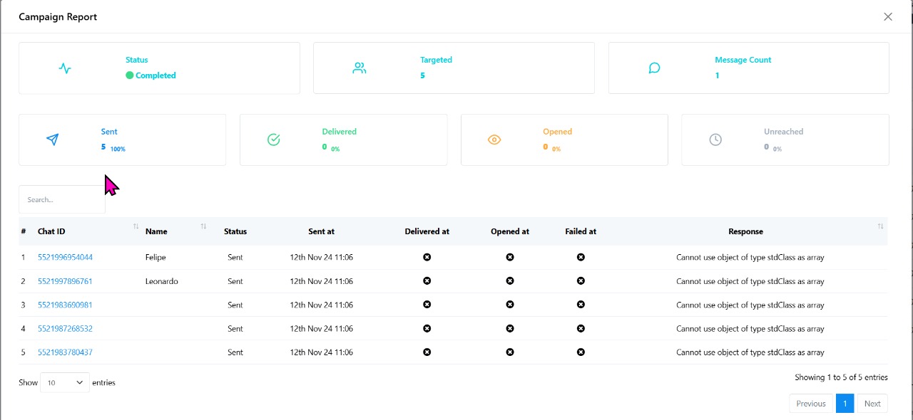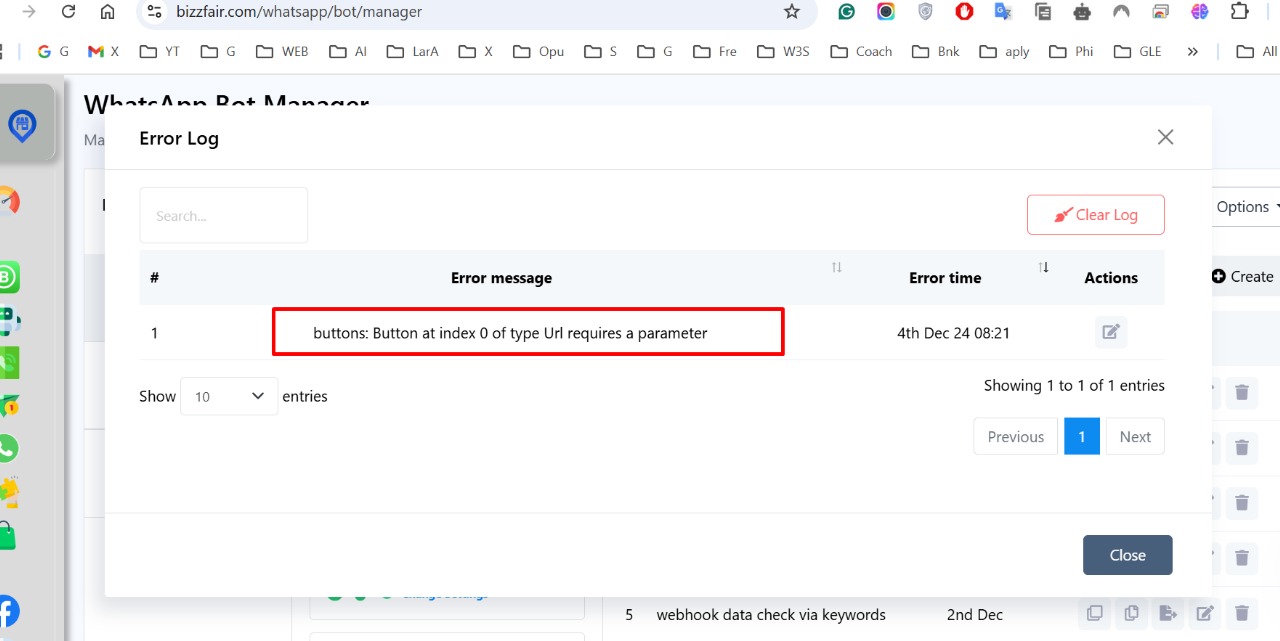 When we set a CTA (call-to-action) template from the chatbot, the template fails to trigger during the chatbot's triggering process. Instead, it results in an error. According to the bot error log, the following error message is being generated: "buttons: Button at index 0 of type Url requires a parameter." Please see the screenshot. https://bot-data.s3.ap-southeast-1.wasabisys.com/upload/2024/12/livechat/376-92210-1114528656920265.jpeg Also, When we create a template from WhatsApp, end with two CTA buttons and one quick reply. It doesn't send through broadcasting. it's giving error "Cannot use object of type stdClass as array" as response https://bot-data.s3.ap-southeast-1.wasabisys.com/upload/2024/12/livechat/376-92210-1109364856750321.jpeg